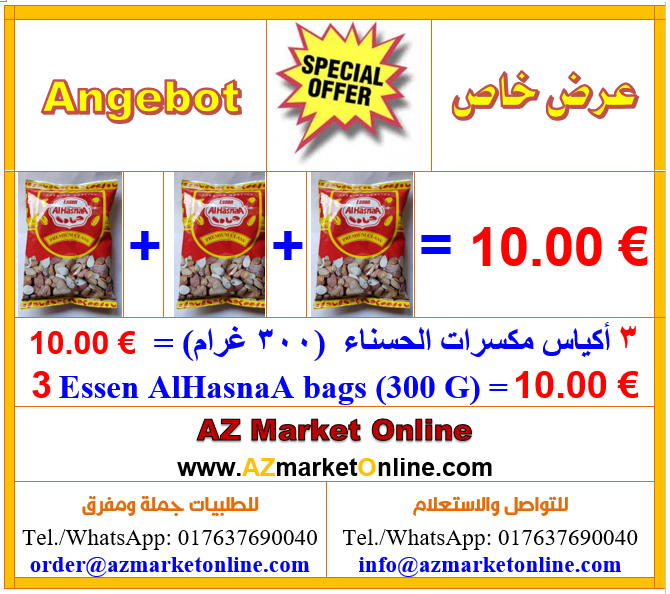 Home / Shop / Special Offers / عرض خاص- Special Offer- أكياس مكسرات الحسناء (300 غرام) – Essen AlHasnaA bags (300 G) Sale! عرض خاص- Special Offer- أكياس مكسرات الحسناء (300 غرام) – Essen AlHasnaA bags (300 G)€12,00 €10,00 Available on backorder عرض خاص- Special Offer- أكياس مكسرات الحسناء (300 غرام) - Essen AlHasnaA bags (300 G) quantity Add to cart Category: Special Offers Description Reviews (0) Description ثلاثة أكياس مكسرات الحسناء (300 غرام) = 10.00 يورو 3 Essen AlHasnaA bags (300 G) = 10.00 € Reviews There are no reviews yet. Be the first to review “عرض خاص- Special Offer- أكياس مكسرات الحسناء (300 غرام) – Essen AlHasnaA bags (300 G)” Cancel replyYour email address will not be published. Required fields are marked *Name * Email * Your rating * Rate… Perfect Good Average Not that bad Very poor Your review * Save my name, email, and website in this browser for the next time I comment. Δ Related products Sale! Canned FoodOthman Food Products Salkini Green Oliven Othman Food 7kg-زيتون سلقيني عثمان فود 7كغ Sale! Shisha and other ProductsSpecial Offers Ma’assel Ice Meloon Alchaam (36)-معسل بطيخ مثلج (36) Sale! FoodsChtoura Products Special Offer- 6 Cans Chtoura garden of different kindfs , 2.99 Euro-عرض خاص- 6 أنواع علب حدائق شتورة ب 2.99 يورو Sale! Canned FoodProcessed Meat Chicken Luncheon Meat Somar 825g-مرتديلا سومر لانشون دجاج 825غ